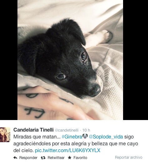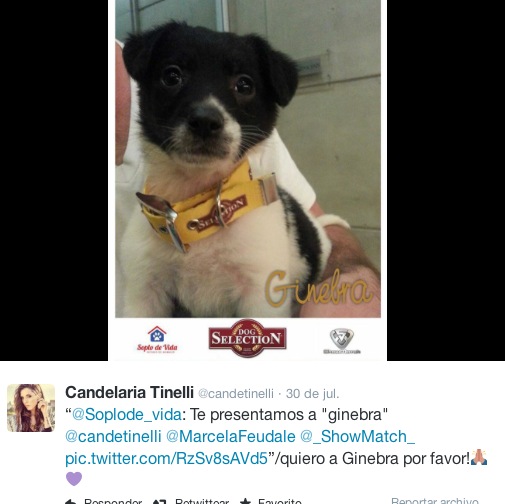La hija de Marcelo Tinelli, ya tiene una perrita llamada Linda de raza Jack russell, pero el destino hizo que en el estudio de Showmatch se encuentre con «Ginebra», así fue como bautizo a una cachorrita mestiza que estaba con la gente de «Soplo de vida».