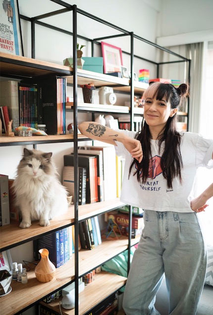 Lucía Franzé es tatuadora y arquitecta, más conocida como Lulens en el mundo virtual. En su antebrazo lleva tatuado a René, su adorado gato, que llegó tiempo atrás. Observar la rutina de su felino, le recuerda que las cosas importantes son las más simples.