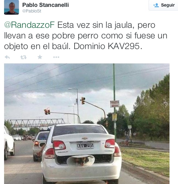 Mediante su cuenta de Twitter el ministro de Interior y Transporte, Florencio Randazzo, anunció que sancionará a los conductores que lleven animales en jaula fuera de los vehículos.